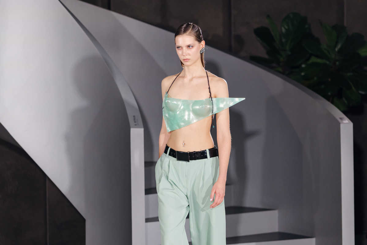 „Vienas ryškiausių kolekcijos akcentų – iš perdirbto stiklo formuojami korsetai, aksesuarai ir konstrukciniai elementai. Stiklas čia veikia ne tik kaip dekoratyvinė detalė, bet ir kaip struktūrinė medžiaga, apibrėžianti kūno linijas ir kurianti trapaus šarvo įspūdį. Vyriškuose siluetuose ši medžiaga interpretuoja jėgos estetiką – išryškinami raumenų ir kūno struktūros motyvai, kurie dėl pasirinktos medžiagos įgauna papildomą kontrastą tarp galios ir pažeidžiamumo”, – sako L. Dailidėnienė.
