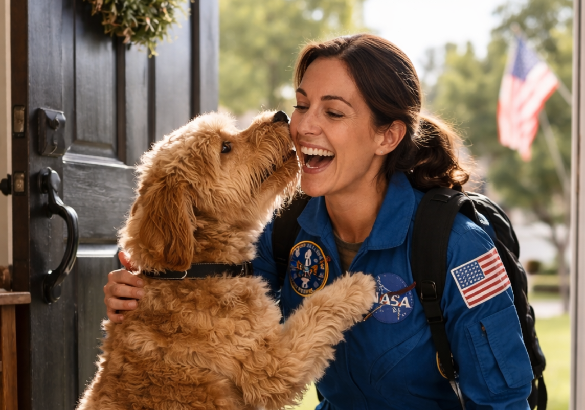 Astronautė, vilkinti mėlyną NASA kostiumą, iškart atsiklaupė, kad galėtų apkabinti savo augintinę. Ši scena akimirksniu tapo tikru interneto hitu.