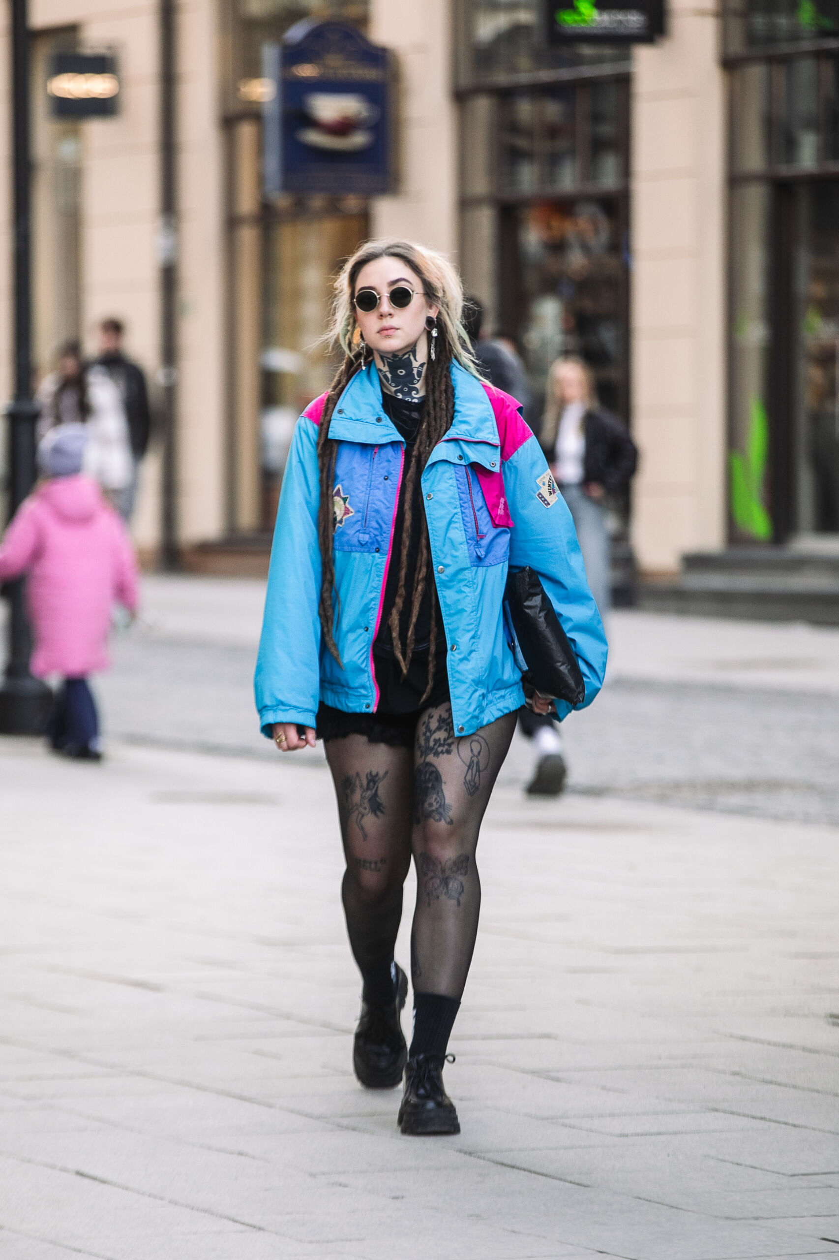 Visai kitokią nuotaiką kuria spalvinga mėlyna ir rožinė striukė, derinama su tamsiais drabužiais, raštuotomis pėdkelnėmis, masyviais batais ir išskirtiniais aksesuarais. Tai įvaizdis, kuris neabejotinai kalba apie drąsą būti savimi. Čia mada nėra skirta susilieti su minia – priešingai, ji naudojama kaip tapatybės ženklas.