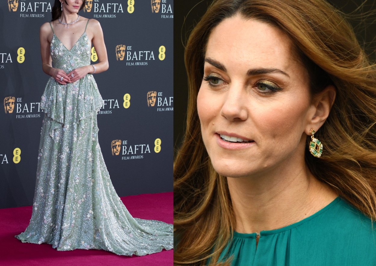 Paskutinį kartą princas Williamas ir Catherine BAFTA apdovanojimuose dalyvavo 2023 m. Tąkart Velso princesė pasipuošė kerinčia balta vakarine suknele, sukurta mados namų „Alexander McQueen“. Asimetriško kirpimo suknelė buvo pasiūta iš lengvo taftos audinio, dramatiškumo įvaizdžiui suteikė kaspinas ties petimi, ilga platėjanti rankovė ir ilgos juodos operos stiliaus pirštinės. 2023 m. ceremonijoje Kate Middleton ne vieną nustebino aksesuarų pasirinkimu – ji segėjo kabančius greitosios mados ženklo „Zara“ auskarus. Ilgi aukso spalvos auskarai, dekoruoti metaliniais gėlių žiedais, stilingai papildė princesės įvaizdį.
