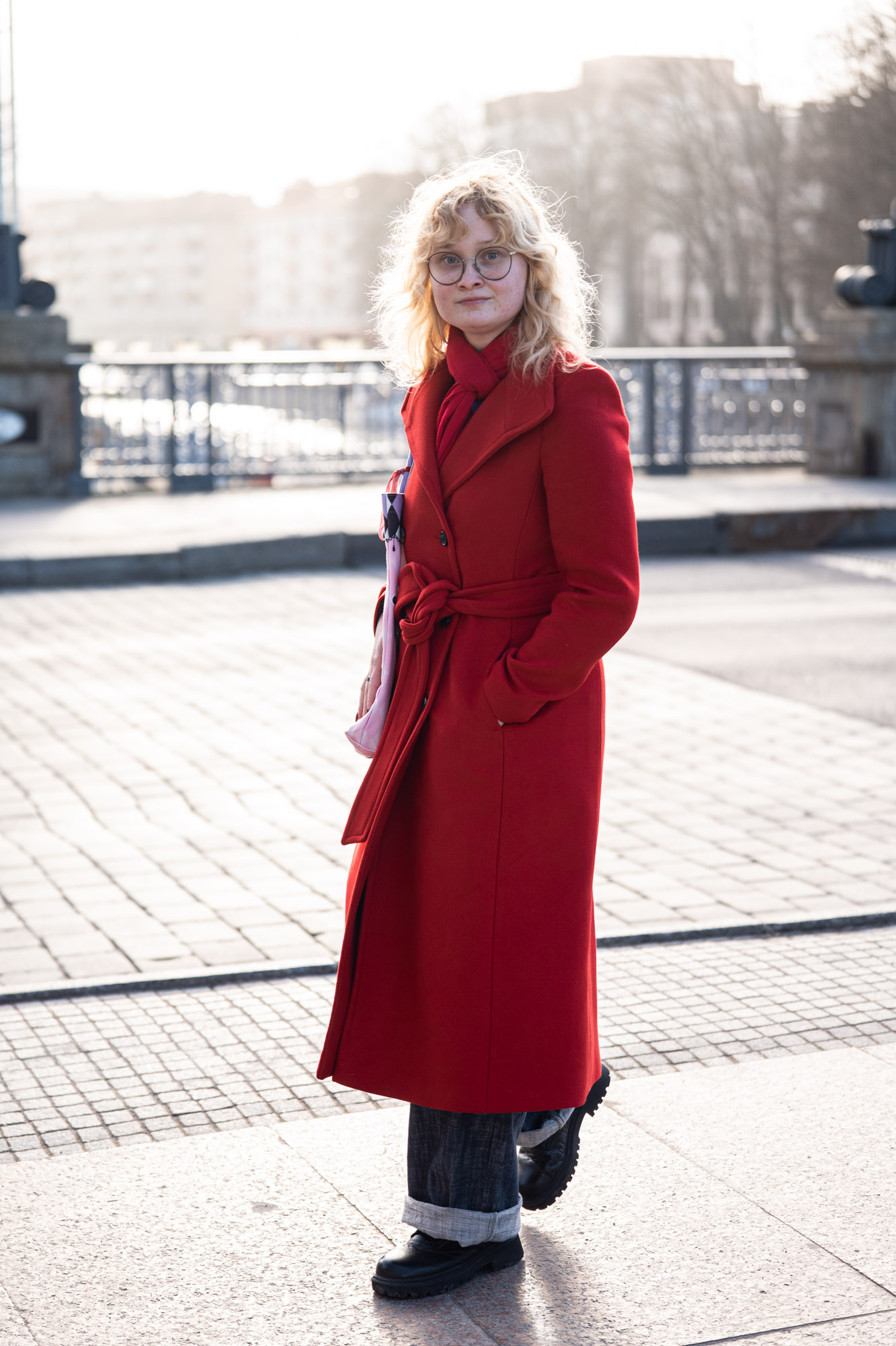Raudonas paltas nereikalauja daug papildomų akcentų. Jis pats tampa viso derinio centru, todėl likusios detalės gali būti paprastesnės: tamsesni batai, klasikiniai džinsai, kuklūs aksesuarai. Būtent toks balansas ir atrodo moderniausiai.