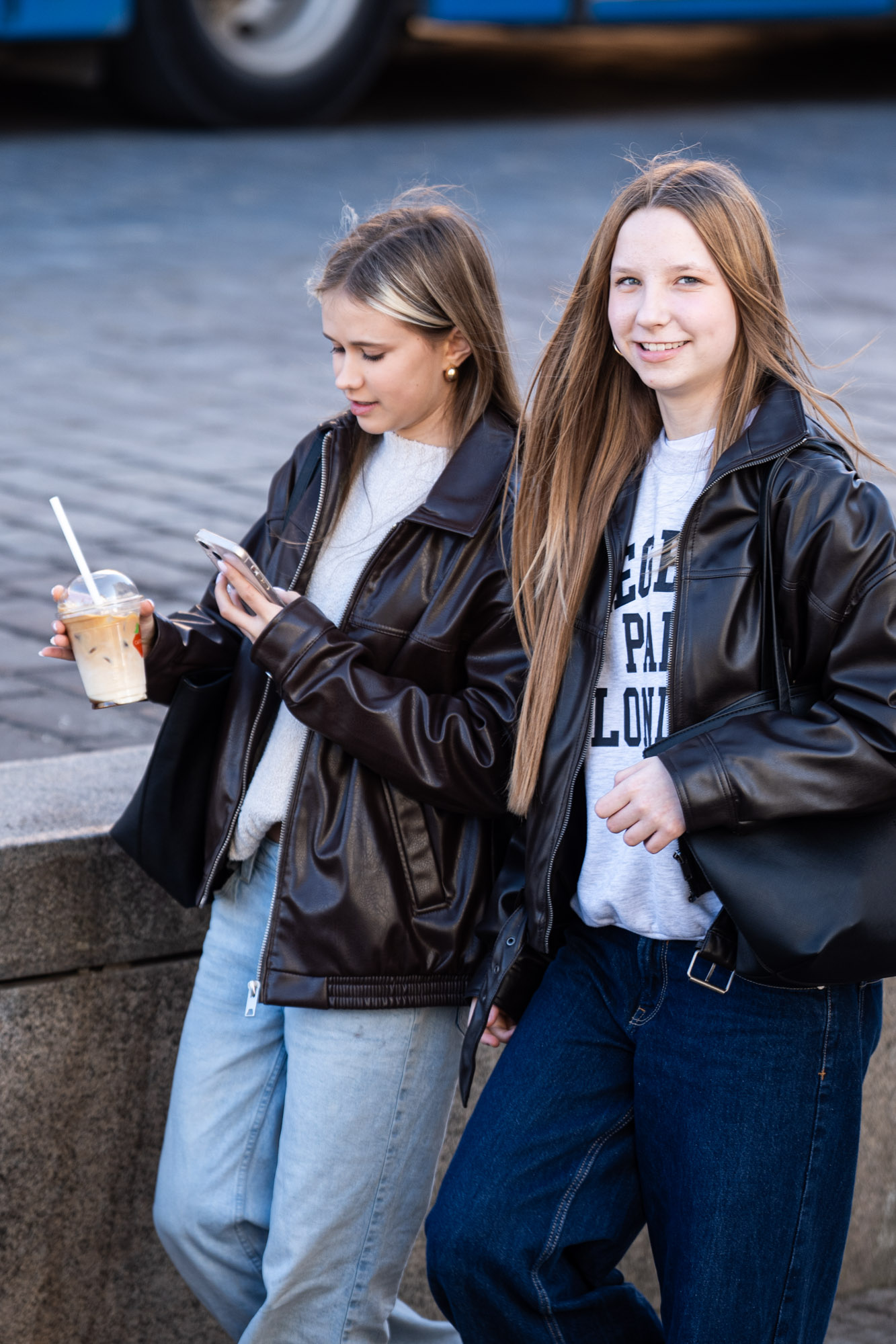 Nuotraukose aiškiai matyti ir dar viena tendencija, kuri iš mados nesitraukia jau kurį laiką – odos imitacijos striukės. Klaipėdoje jos derinamos labai įvairiai: nuo moteriškų įvaizdžių su lengvo kritimo sijonais iki kasdienių derinių su džinsais ir megztiniais.