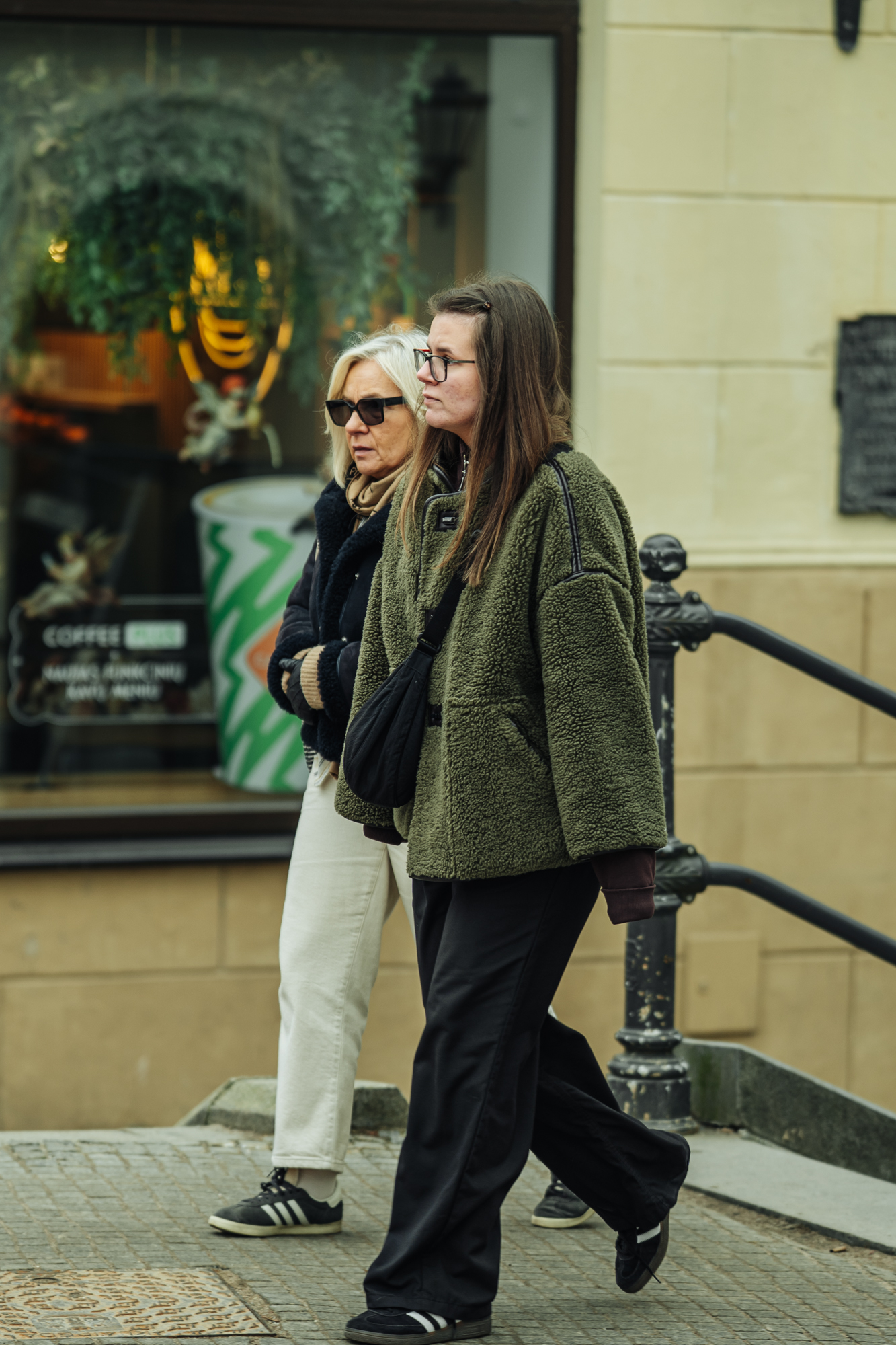 Tai puikiai atspindi kadras, kuriame vaikšto pora: vyras vilki bomber tipo striukę, plačias šviesias kelnes, sportinius batelius ir akinius nuo saulės, o šalia esanti moteris renkasi ilgą pilką paltą, džinsus ir minimalistinę rankinę. Abu įvaizdžiai skirtingi, tačiau puikiai dera toje pačioje miesto aplinkoje. Vienas labiau atsipalaidavęs, kitas santūresnis, bet abu atrodo šiuolaikiškai.