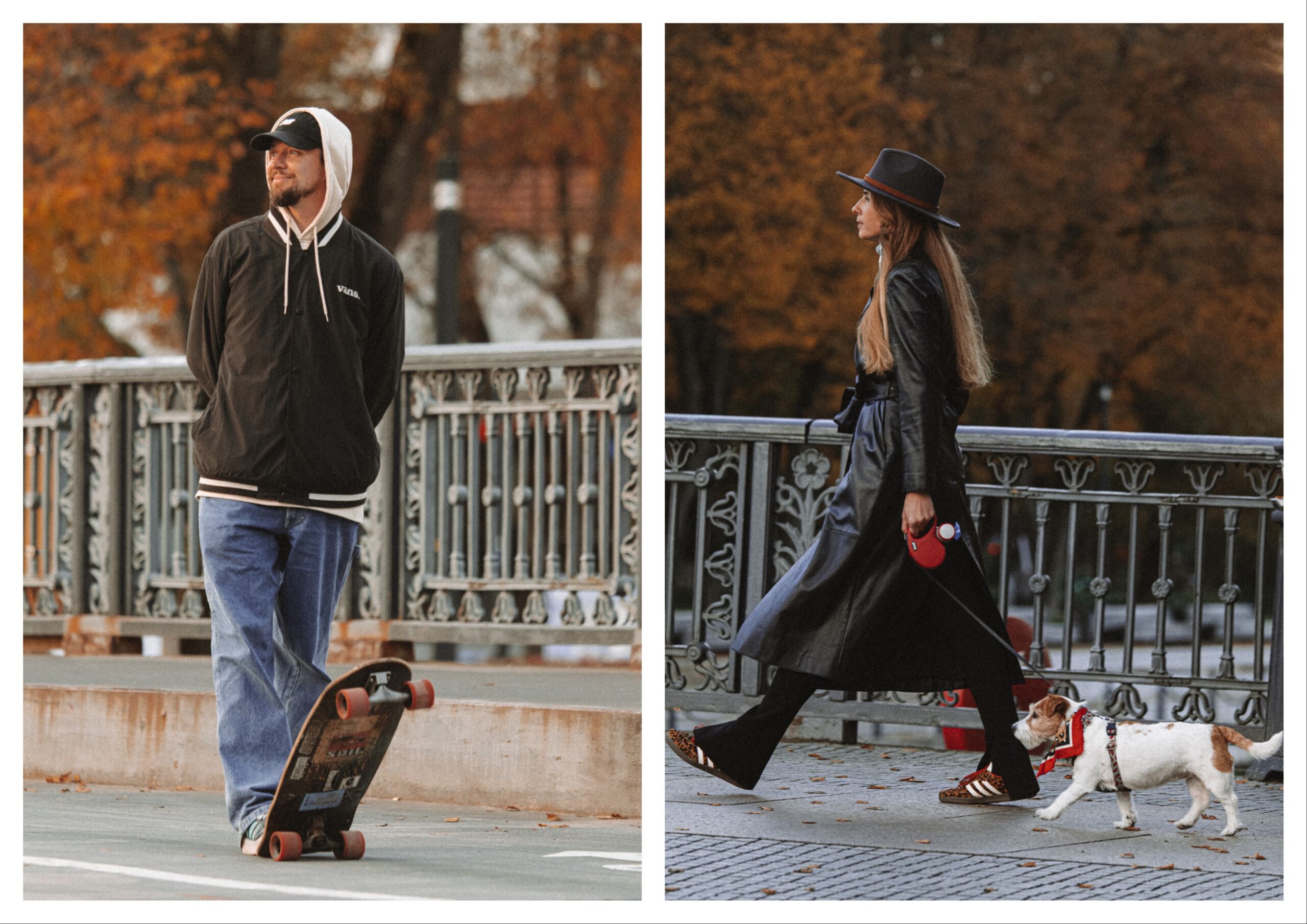Ilgas odinis paltas, platus skrybėlės snapelis ir derantys aksesuarai – įvaizdis, kuris tiesiog spinduliuoja eleganciją ir pasitikėjimą savimi. Tai Klaipėdos rudens romantika: miesto pasivaikščiojimas su šunimi, stilinga apranga ir natūralus pasididžiavimas savo išskirtinumu.