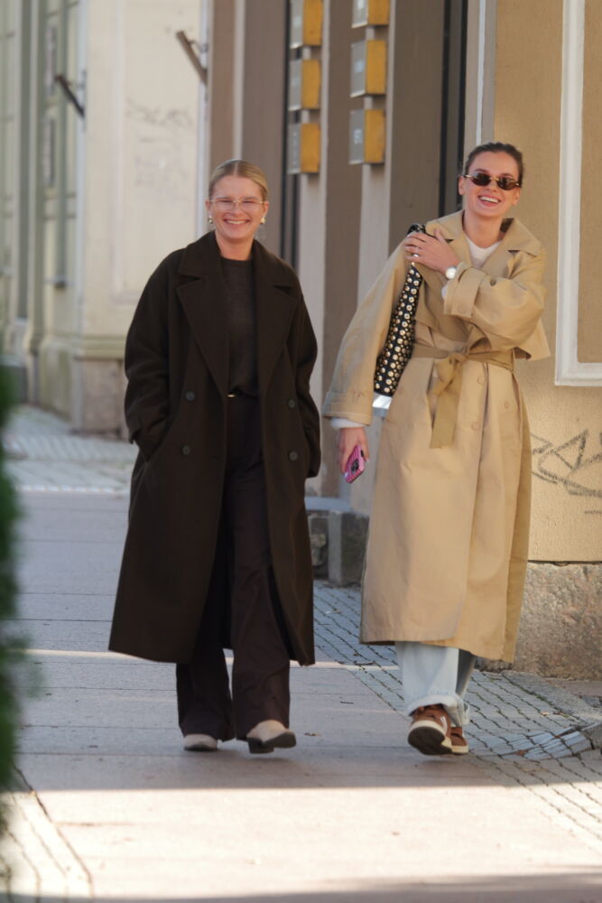 Dviejų merginų deriniai byloja apie oversize paltų sugrįžimą – juodas vilnonis paltas bei klasikinis smėlio spalvos trench’as kuria kontrastą, bet tuo pačiu kalba ta pačia madinga kalba. Derinami su plačiomis kelnėmis, sportbačiais ir stilingais aksesuarais – jų įvaizdžiai šiuolaikiški, bet neperkrauti.