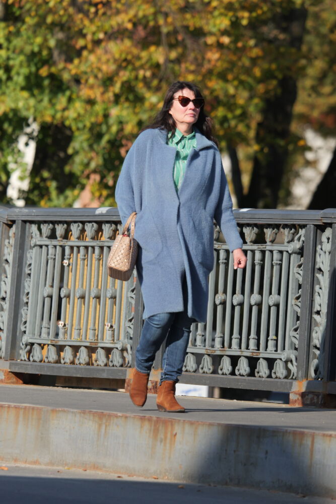 Dailiai prigludęs mėlynas paltas-megztinis derinamas su džinsais ir rudeniniais aulinukais – subtilus, šiltas ir jaukus miesto įvaizdis. Žalsvai dryžuoti marškiniai po paltu suteikia įvaizdžiui ryškesnę dinamiką – puikus pasirinkimas toms, kurios nori išlikti pastebimos, bet ne rėkiančios.