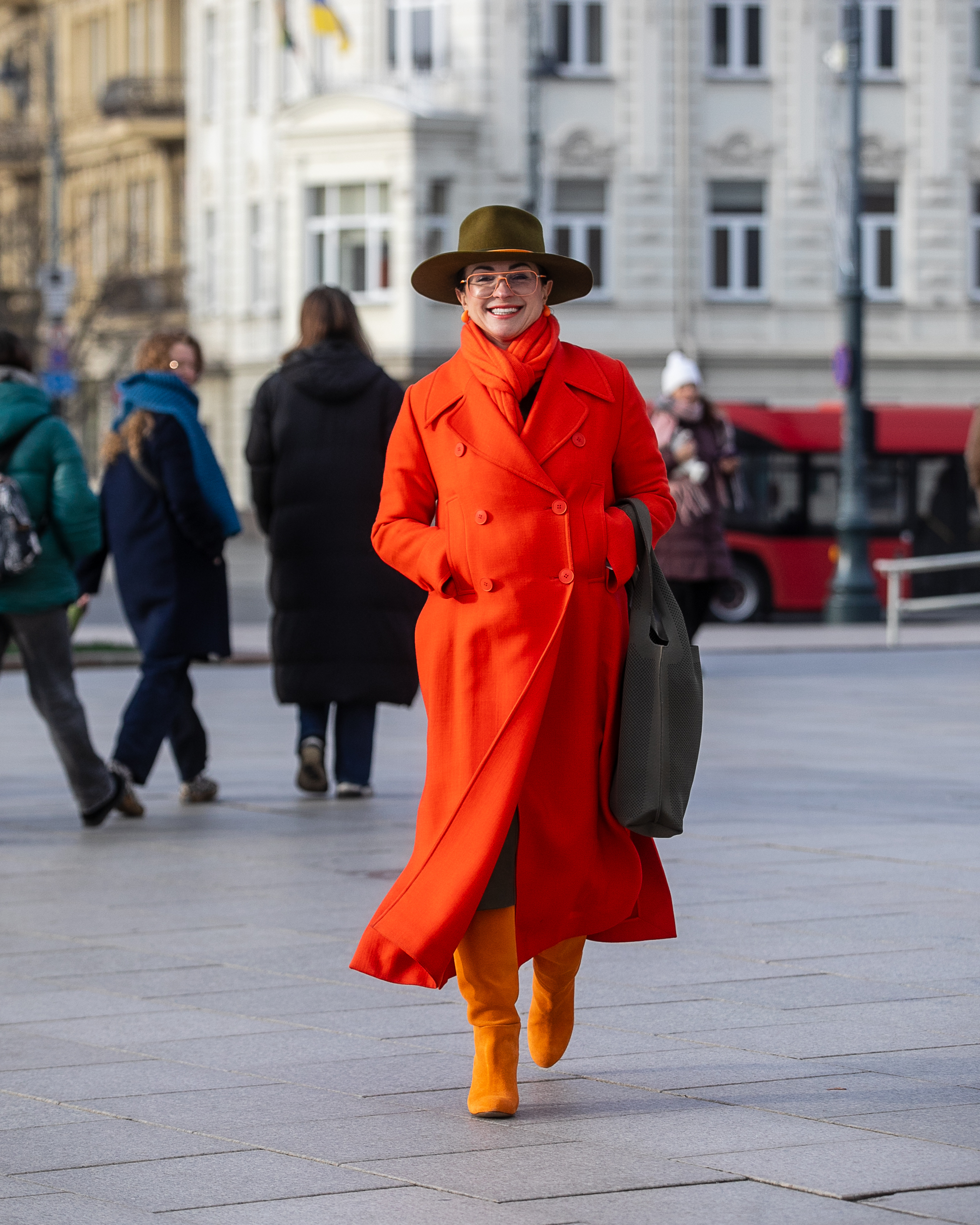 Pirmojoje nuotraukoje matomas įvaizdis nepalieka abejingų. Ryškiai oranžinis paltas su tokios pačios spalvos ilgaauliais batais – tai tobulas pavyzdys, kaip viena spalva gali tapti viso įvaizdžio ašimi. Derinys atrodo ne tik moderniai, bet ir šiltai, energingai. Pridėta tamsiai alyvuogių žalia skrybėlė – akcentas, kuris suteikia rafinuotumo ir kontrasto. Tai – puikus įrodymas, jog žiemos gatvės nebūtinai turi būti pilkos.
