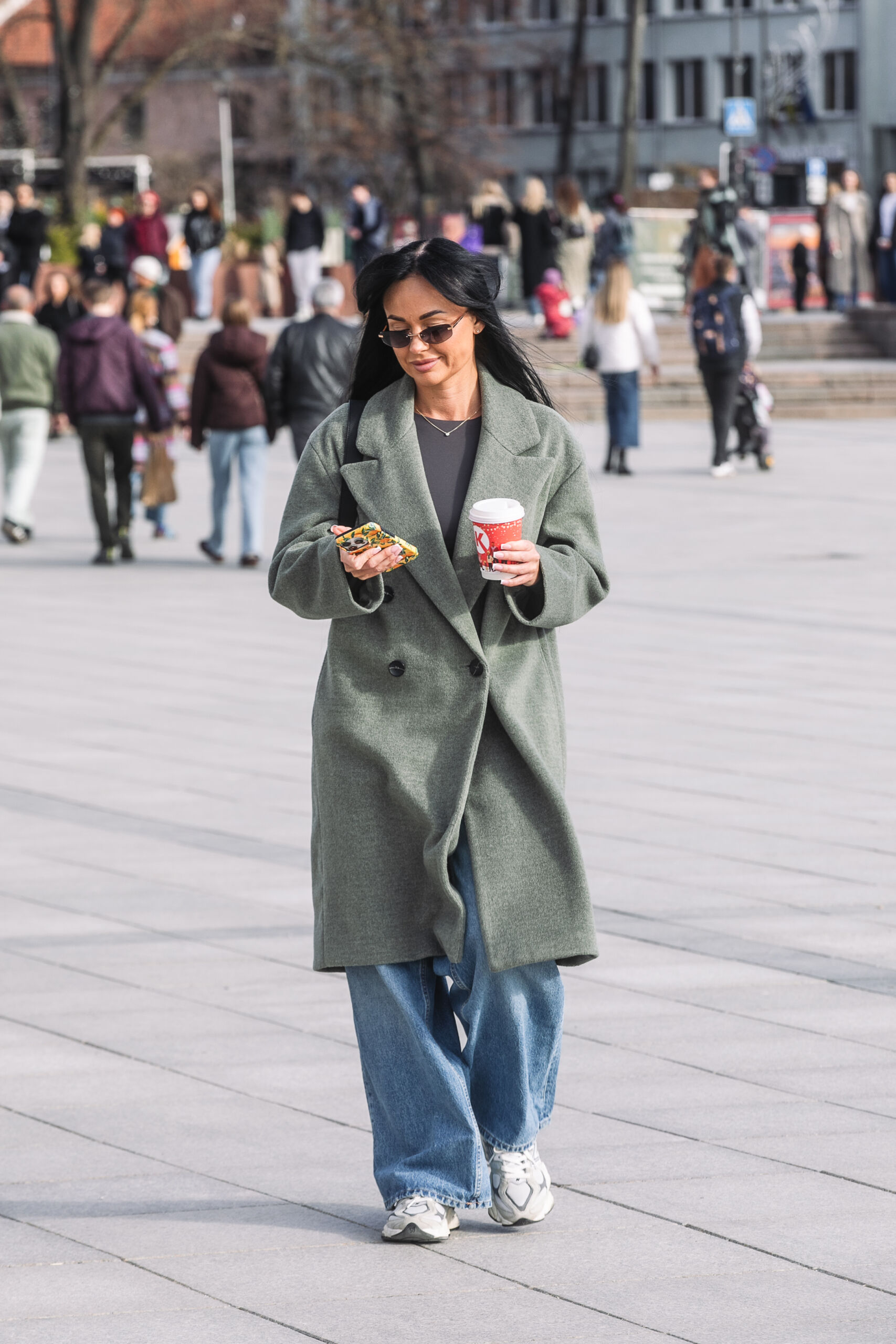 Vienas ryškiausių akcentų šiose gatvės stiliaus nuotraukose – ilgi paltai. Jie atrodo ne tik elegantiškai, bet ir labai universaliai. Matyti, kad šį sezoną populiarūs tiek klasikiniai juodi, tiek švelnesni pilkšvai žalsvi ar rusvi atspalviai. Tokie paltai kuria išbaigtą siluetą, suteikia įvaizdžiui brandos ir lengvos prabangos pojūtį.
