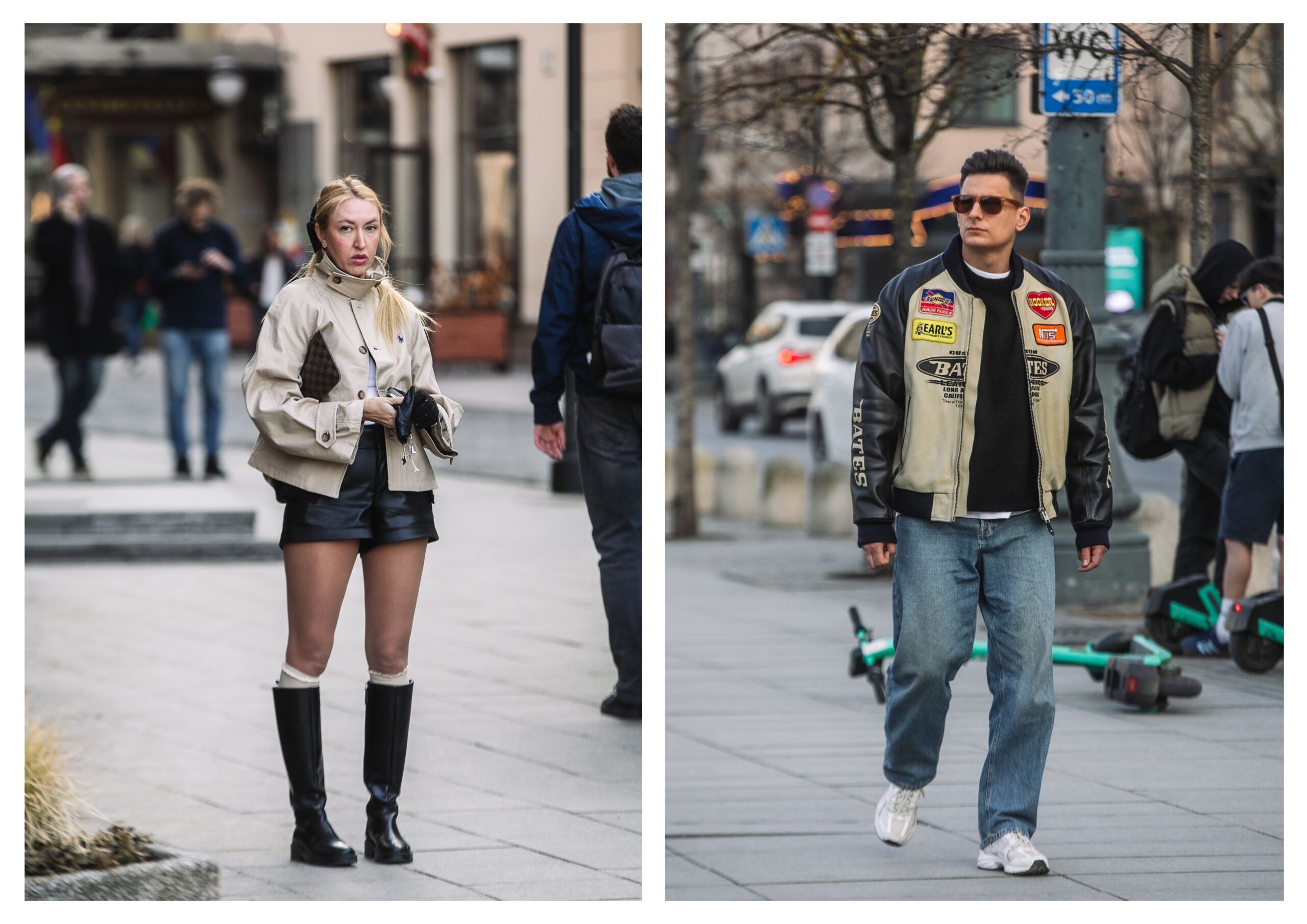 Nuotraukose puikiai matyti ir tai, kad vyrų gatvės mada toliau išlaiko kryptį į laisvesnius siluetus, oversized viršutinius drabužius ir patogesnį džinsų kirpimą. Matomi platesni džinsai, laisviau krintantys bomberiai, sportiškesnio stiliaus striukės, retro nuotaiką turinčios detalės.