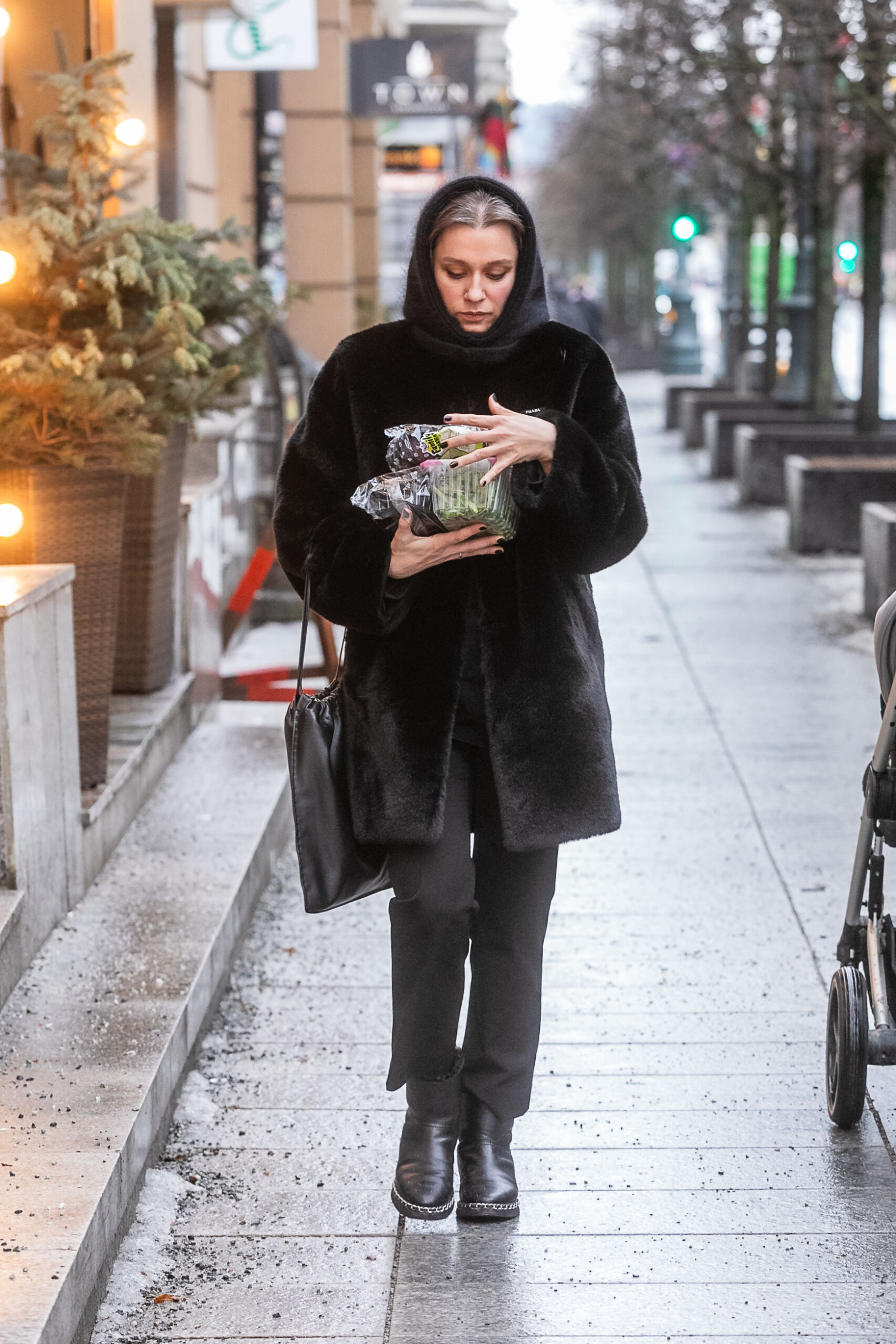 Juodas kailinis paltas, gobtuvas, juodi aulinukai ir minimalistinė rankinė – šiame kadre dominuoja monochrominis įvaizdis.