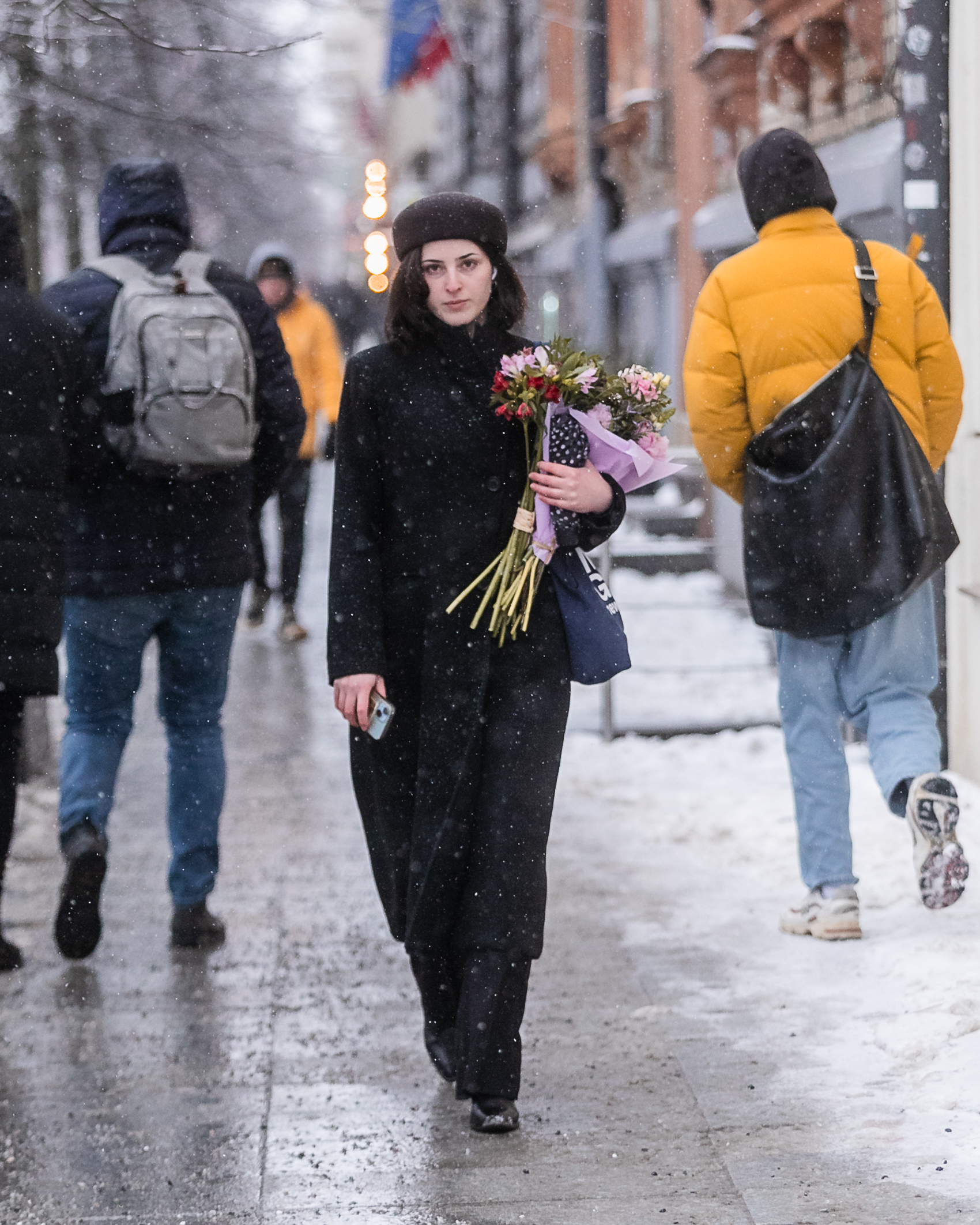 Rankinės – praktiškos, dažnai nešiojamos per petį. Pirštinės, kepurės, avalynė – skirti ne parodymui, o naudojimui. Net gėlės rankose tampa ne aksesuaru, o emocijos detale, kuri sušildo žiemos kadrą.