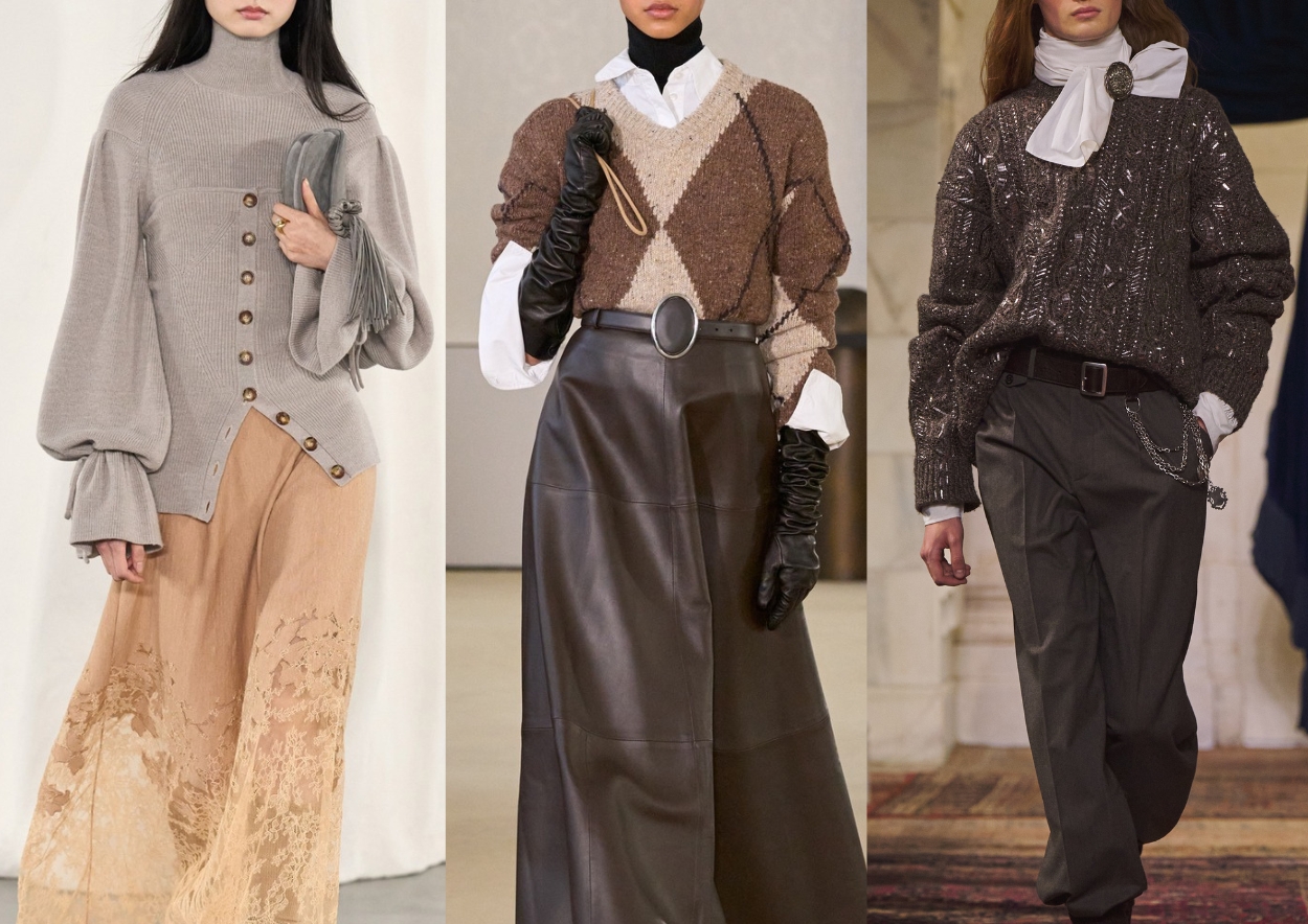 Madingi išliks vientisų megztinių ir prasegtų kardiganų deriniai. Vieni mados namai siūlo vilkėti megztus ansamblius – tų pačių siūlų megztinį ir kardiganą, kiti pristato skirtingų spalvų derinius, akcentuodami mezginių sluoksniavimą.