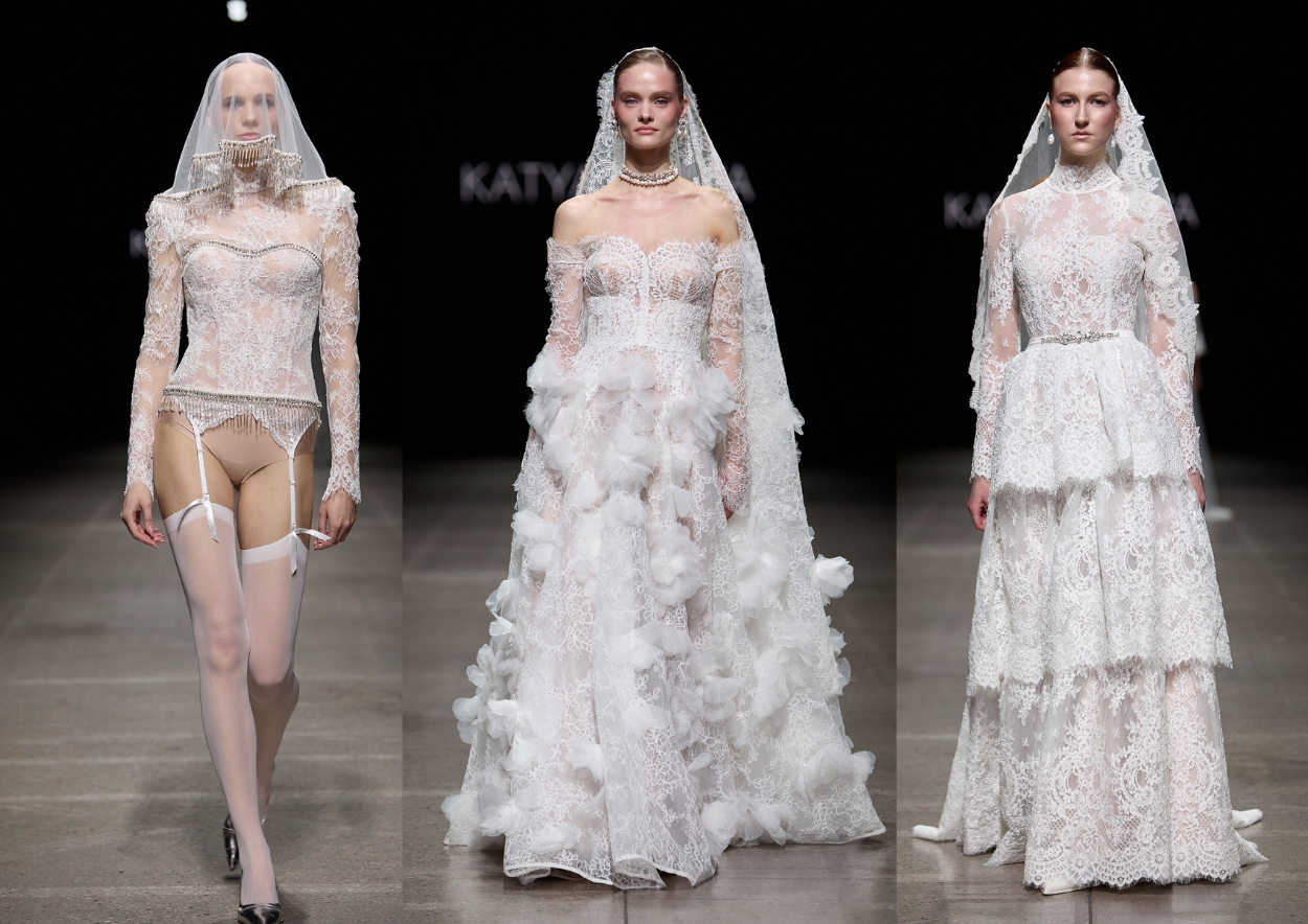 Grafiški nėrinių raštai, rauktų nėrinių kaskados, 3D efekto gėlių žiedai, pasiūti iš plonyčio audinio, uždaros apykaklės ir nėrinių bolero – visa tai sujungia istorines nuorodas su šiuolaikine estetika. Įvaizdžiai įkvėpti karališkų siluetų ir gotikos, tad suknelės atrodo ir prabangiai, ir dramatiškai, o raukinių detalės, audinio žiedlapiai ir korsetai išryškina romantiką ir moteriškumą.