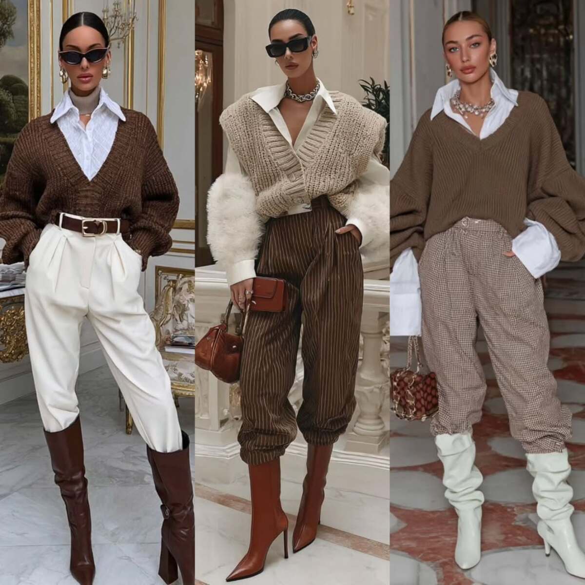 Šis derinys išsiskiria kelnių ir batų duetu. Dažniausiai prie klasikinio stiliaus kelnių aukštu liemeniu (pasirenkamas tiesus arba kiek platesnis siluetas), derinami ilgaauliai batai iki kelių. Kelnių eleganciją pabrėžia klostės arba kantas priekyje ir šviesi audinio spalva. Aukštakulnių batų aulai turėtų siekti kelius, galite rinktis klasikinio stiliaus tiesiais aulais arba labiau prigludusiais. Drąsiausios madistės derina ir kaubojiško stiliaus aulinius.