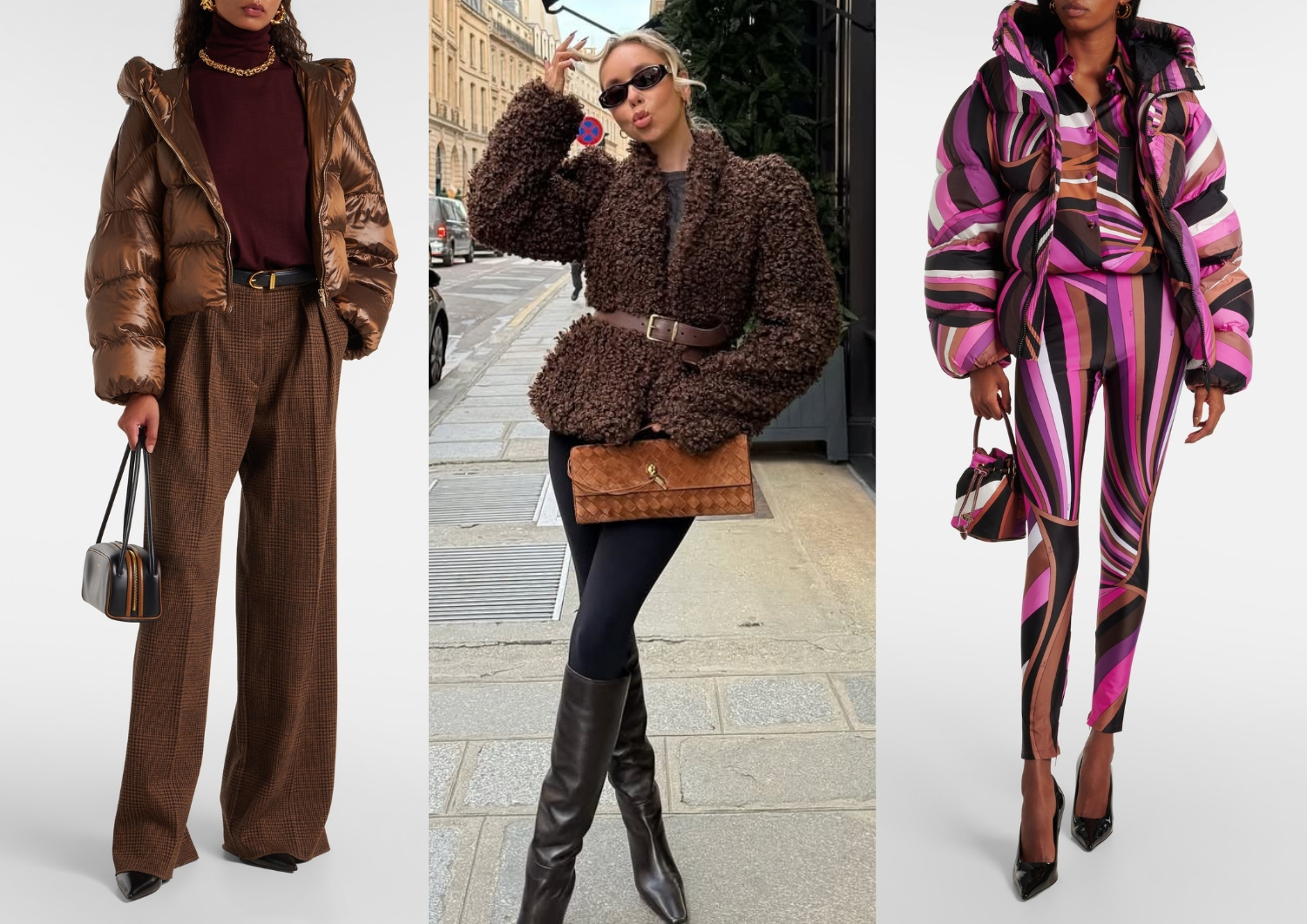 Šį sezoną sugrįžta raštuotų pūkinių striukių tendencija. Klasikos gerbėjoms siūlomos margintos langeliais, elegantišku skaliko dantų raštu, drąsesnėms – leopardų kailio dėmėmis, zebrų dryžiais arba spalvotomis abstrakcijomis, pavyzdžiui, žaismingais mados namų „Pucci“ raštais.