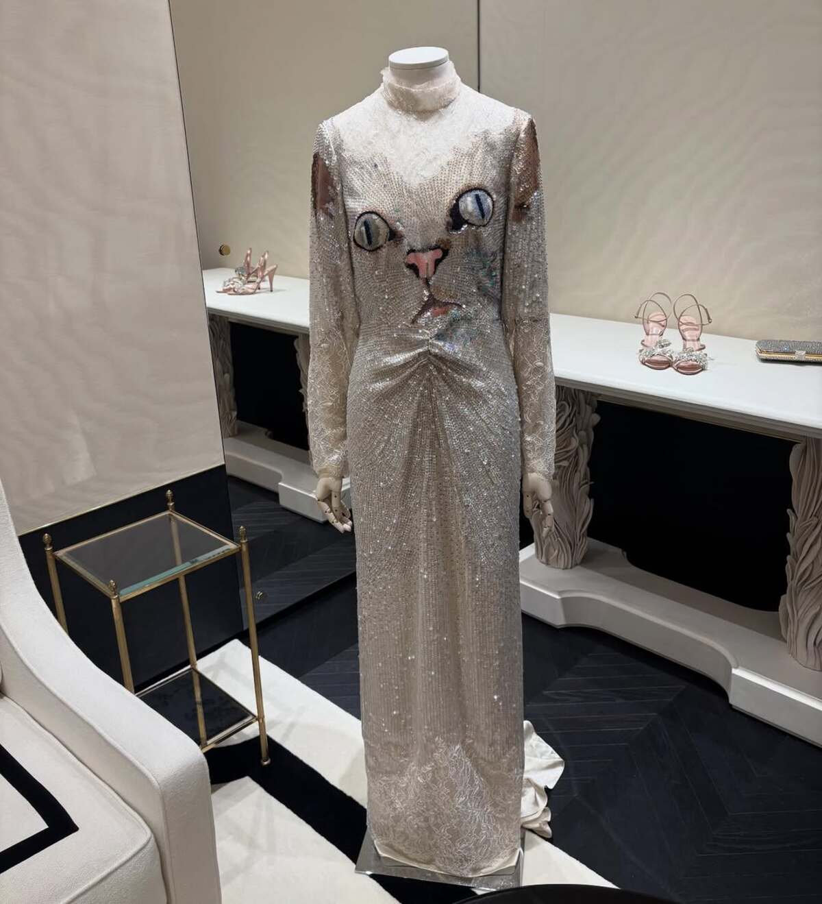 Visgi modeliu, sulaukusiu išskirtinio dėmesio, tapo ilga vakarinė suknelė, nuo… iki… siuvinėta spindinčiomis detalėmis. Jos priekį puošė žaismingas katės snukučio motyvas – šiek tiek suglumusios, žvelgiančiomis didelėmis žydromis akimis.
