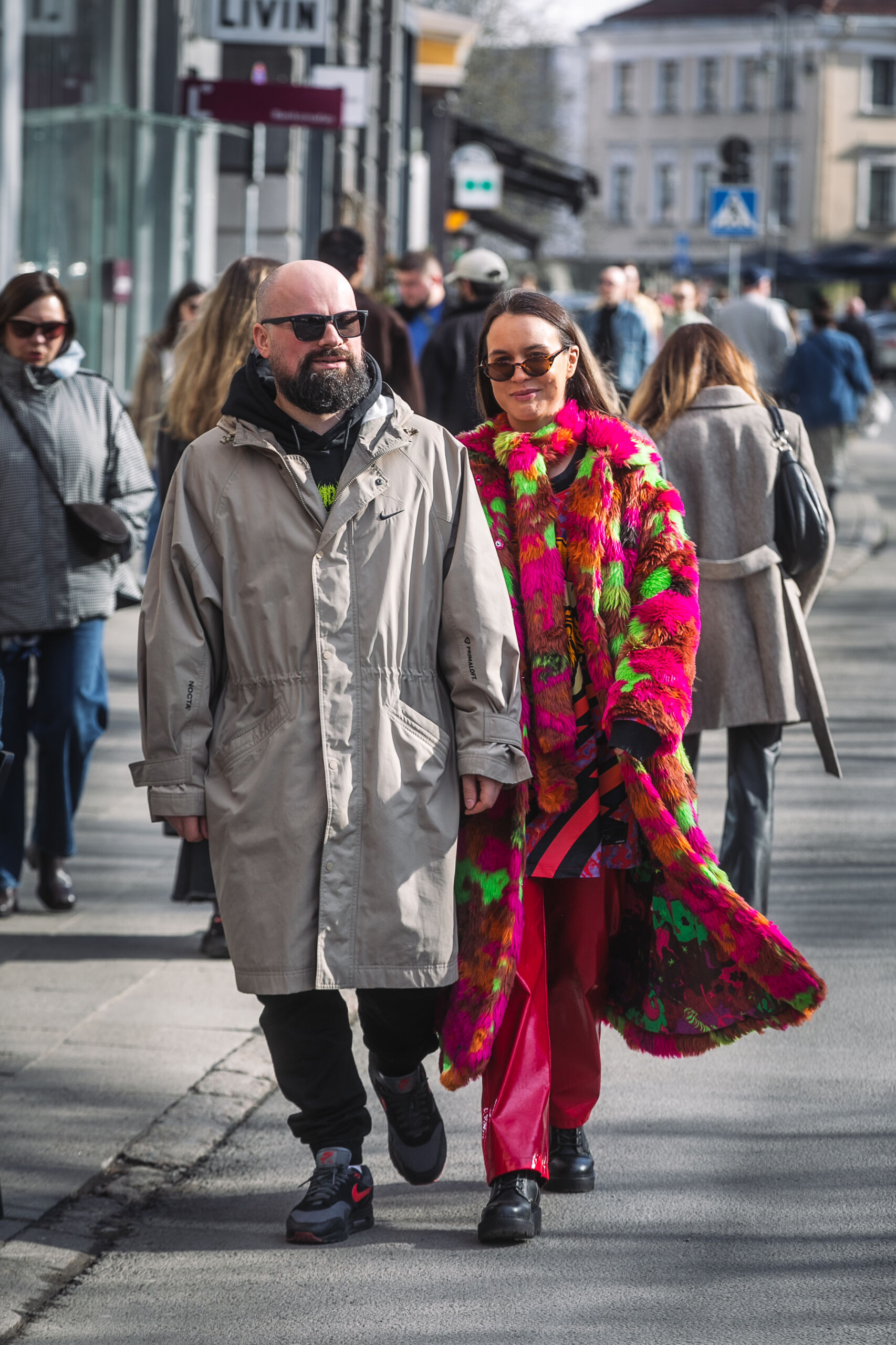 Jei dar neseniai daugelis rinkosi neutralius, tylius tonus, dabar miestas vis dažniau nusidažo ryškesnėmis spalvomis. Vienoje nuotraukoje matomas itin išraiškingas, pūkuotas, spalvingas paltas tampa viso įvaizdžio centru. Rožinė, žalia, oranžinė ir raudona čia ne konkuruoja, o bendradarbiauja. Tai drabužis žmonėms, kurie nebijo būti matomi.
