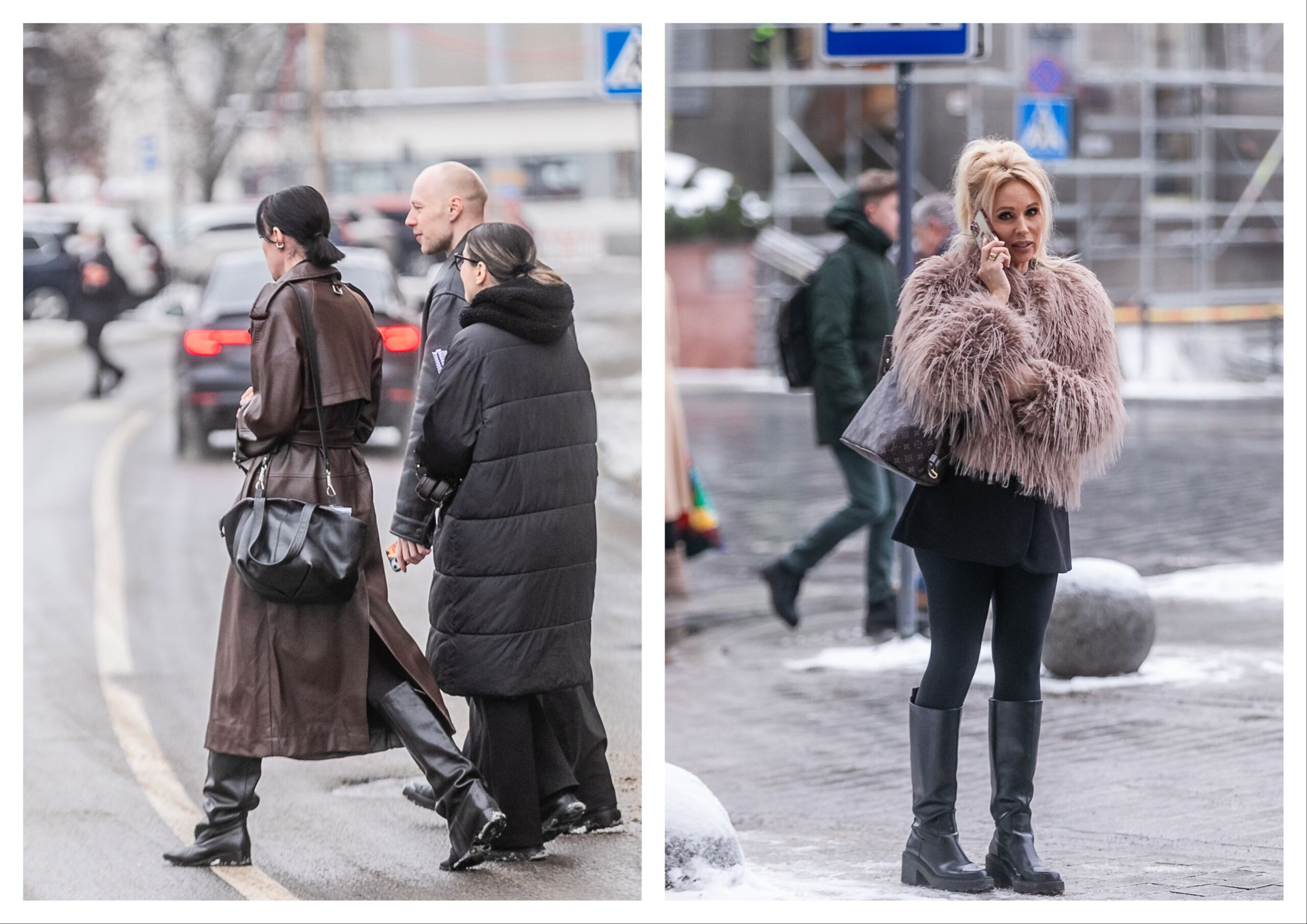 Ilgas rudas odinis paltas – viena stipriausių sezono detalių. Jis kuria griežtą, rafinuotą siluetą ir puikiai dera su aukštakulniais auliniais. Šalia einanti moteris vilki ilgą juodą pūkinį paltą – tai klasikinis, saugus, bet stilingas pasirinkimas.