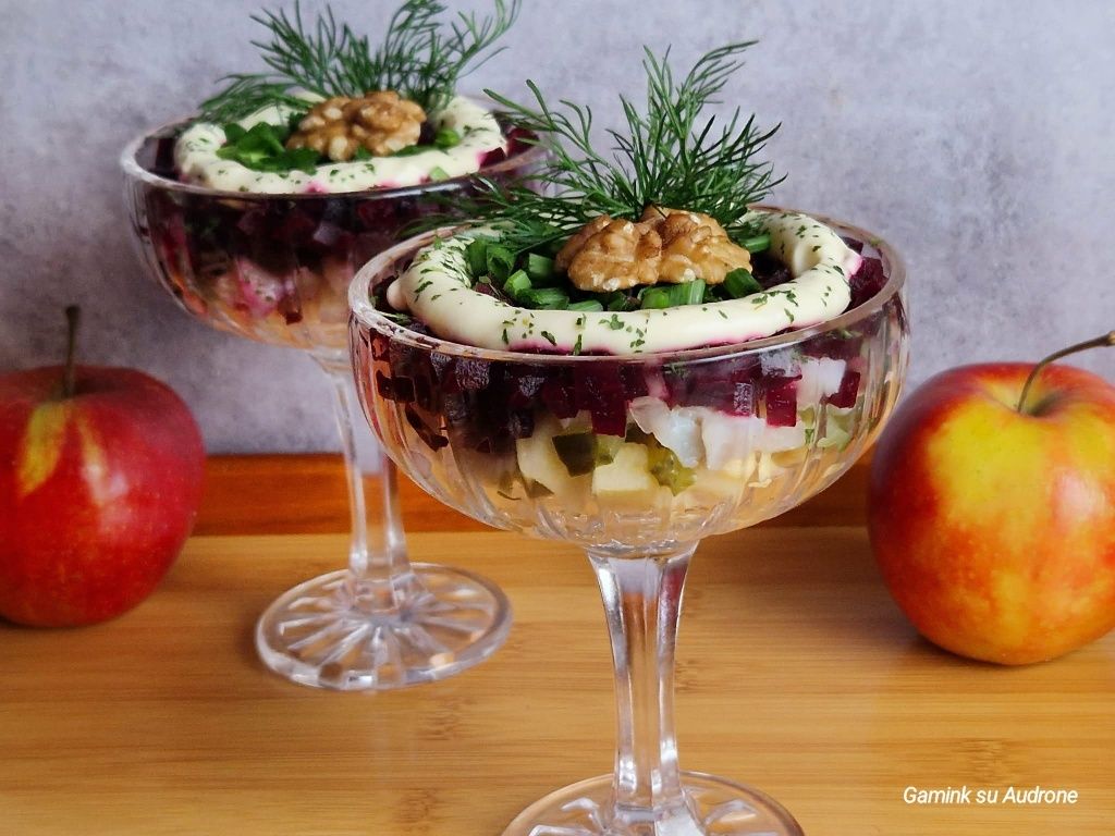 Jei ieškote gardžių, greitai paruošiamų ir šventiniam stalui puikiai tinkančių salotų, šis Gamink su Audrone receptas kaip tik jums. Burokėlių salotos su silke ir obuoliais nustebina puikiu skonių deriniu: čia susitinka švelnus burokėlių saldumas, lengva obuolio gaiva, malonus rauginto agurko rūgštumas ir sodrus silkės skonis.