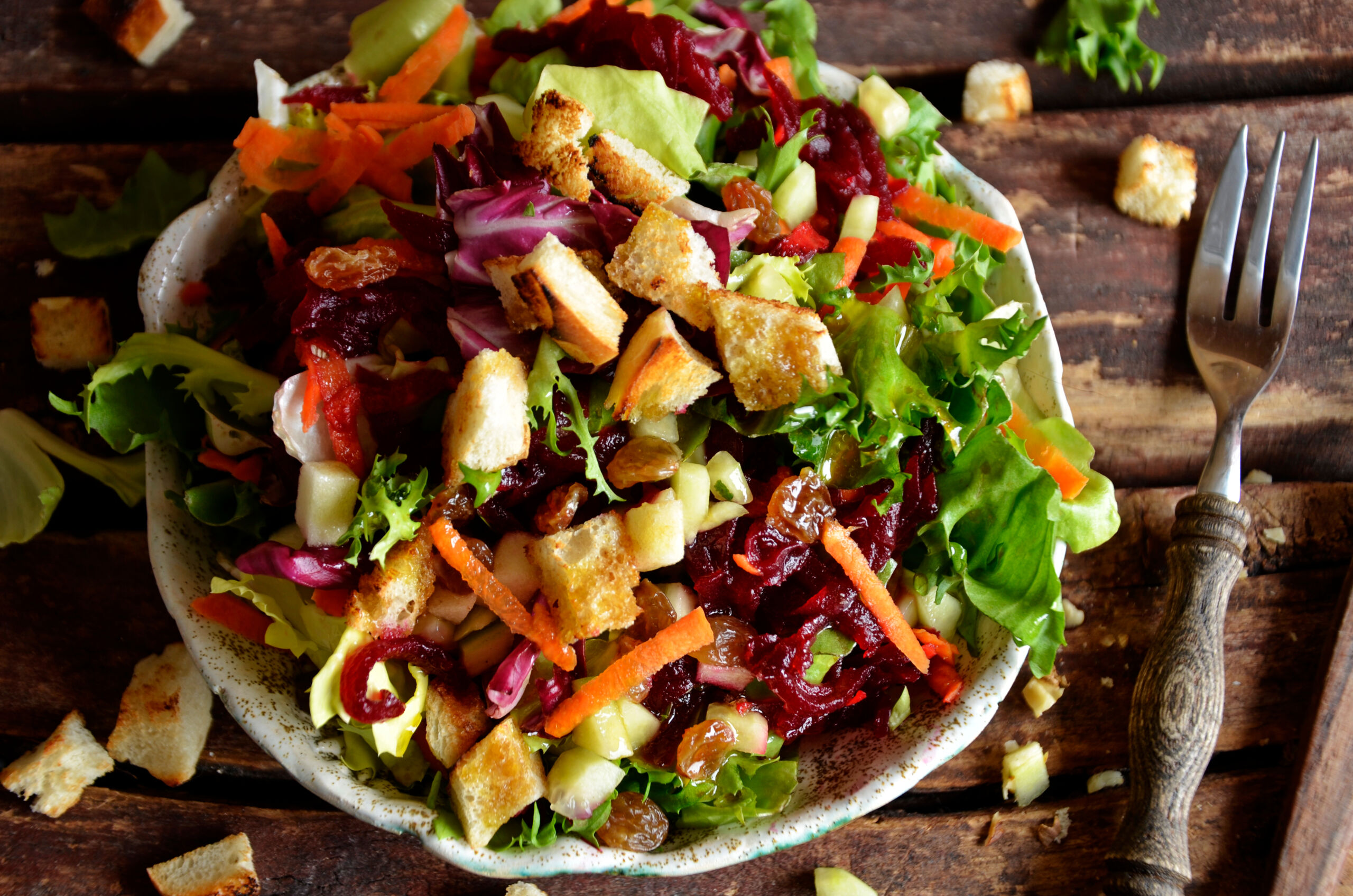 Į dubenį sudėkite daržoves, salotų lapus ir traškius duonos kubelius. - Paruoškite padažą.