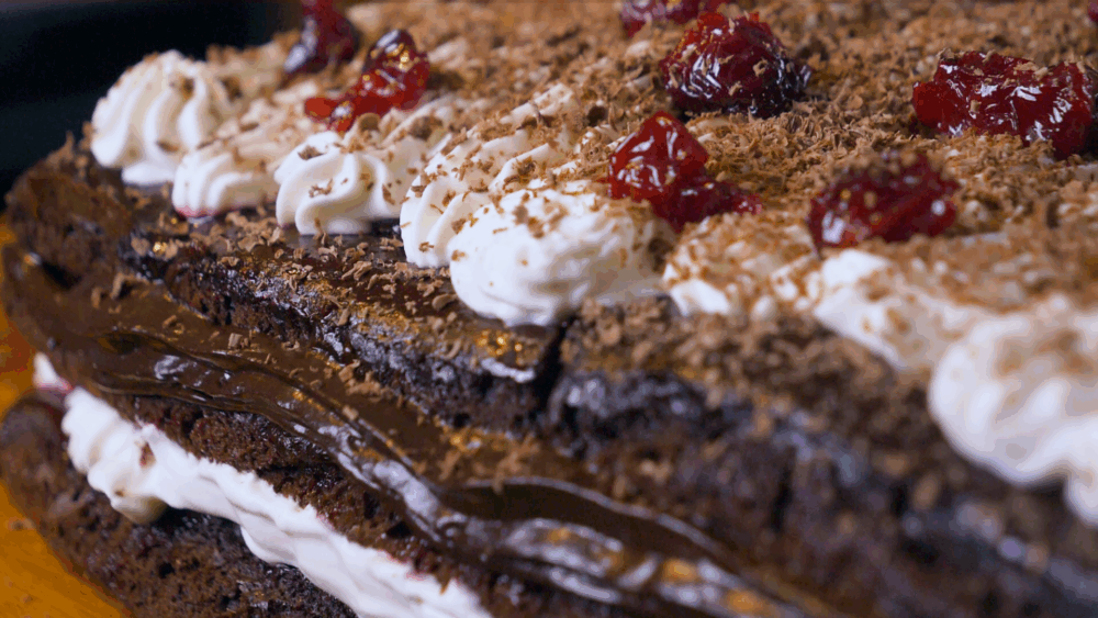 Ant pirmojo biskvito tepkite grietinėlę, pabarstykite vyšniomis ir uždėkite kitą biskvitą. Ant antrojo biskvito sudėkite visą šokoladinį kremą ir vėl pabarstykite vyšnių. Uždėkite paskutinį biskvitą, ji tepkite grietinėle ir puoškite šokolado drožlėmis. Skanaus!