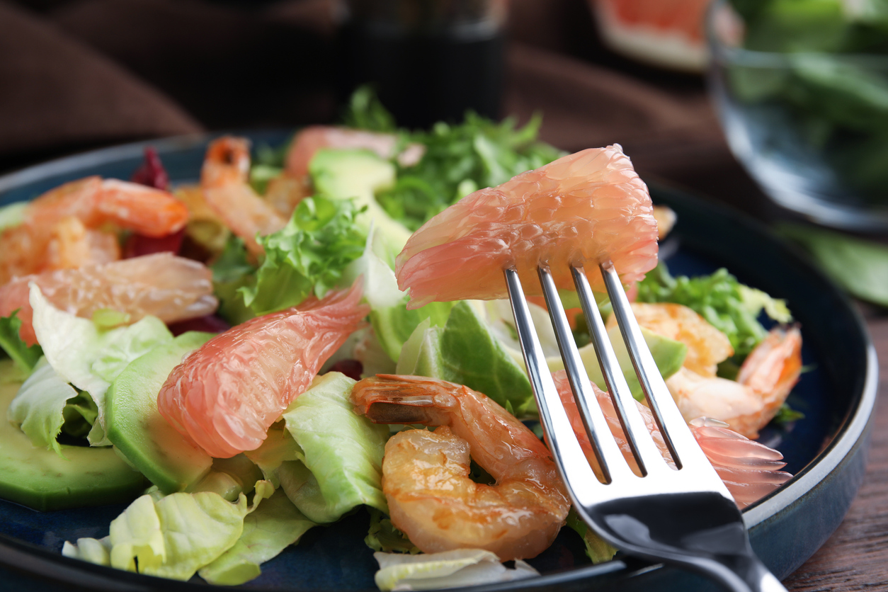 „Pomelo“ nulupkite ir atskirite skilteles nuo plėvelių. Avokadą supjaustykite kubeliais, raudonąjį svogūną – plonais griežinėliais. Krevetes iškepkite su šiek tiek sviesto, česnako ir druskos. Į dubenį sudėkite „Pomelo“ skilteles, avokadą, svogūną, susmulkintas mėtas ir riešutus. Apšlakstykite žaliosios citrinos sultimis ir alyvuogių aliejumi, švelniai išmaišykite. Ant viršaus išdėliokite krevetes. Gaivios salotos puikiai tiks pietums ar vakarienei“, – receptą siūlo „Iki“ kulinarijos šefė.