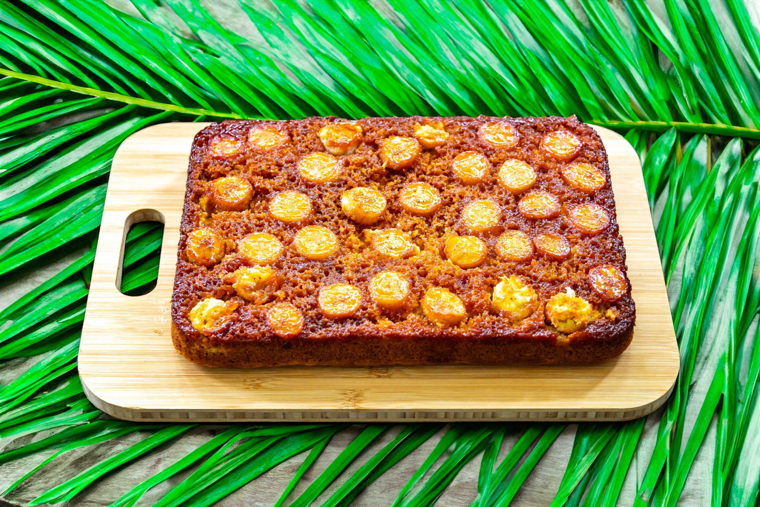 Užpilkite paruoštą tešlą ant karamelizuotų bananų formoje. Kepkite 180 °C orkaitėje apie 40–45 minutes, kol įkištas pagaliukas išeis sausas.