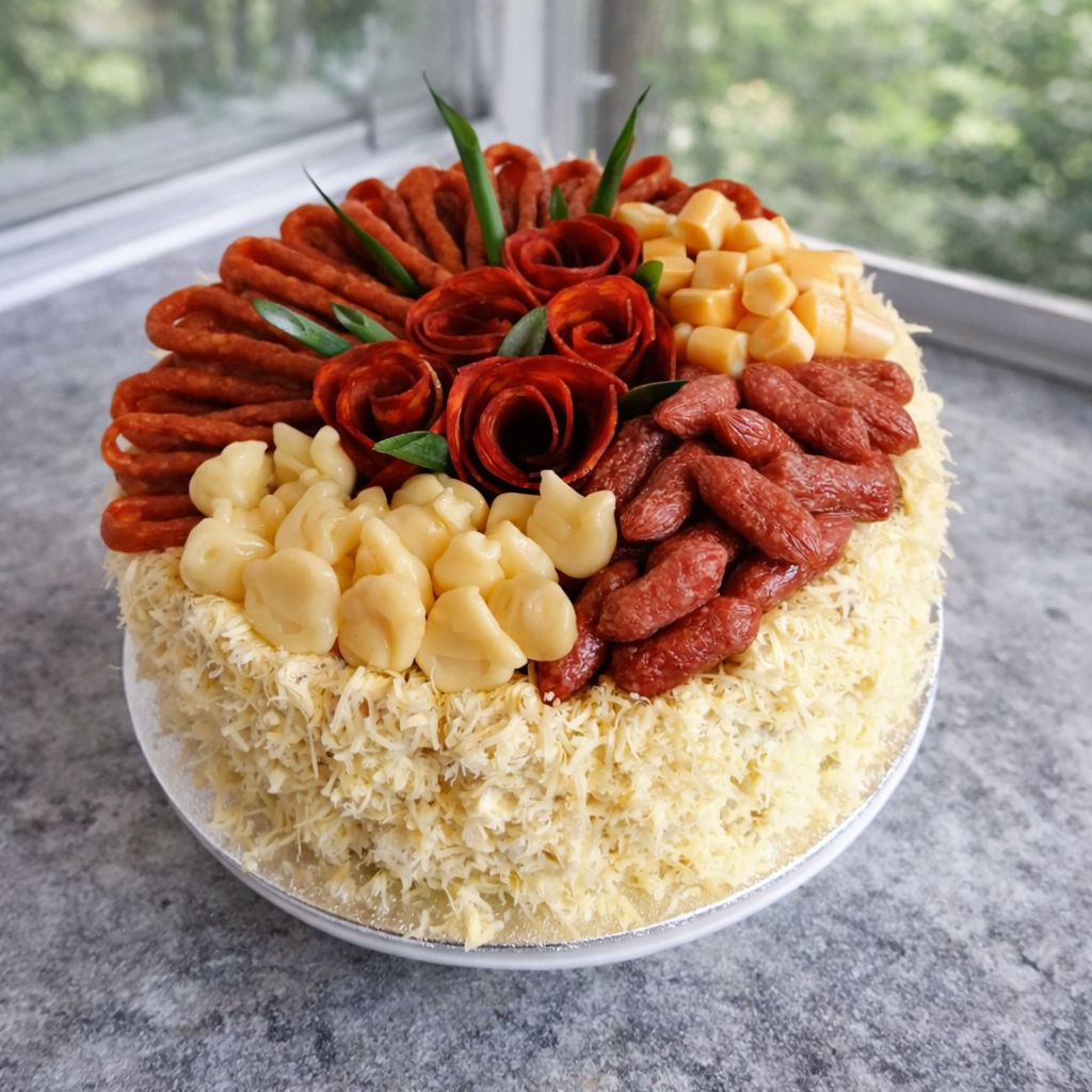 - Viršų ir šonus galite papildomai apibarstyti sūrio drožlėmis ar papuošti mėsos griežinėliais.