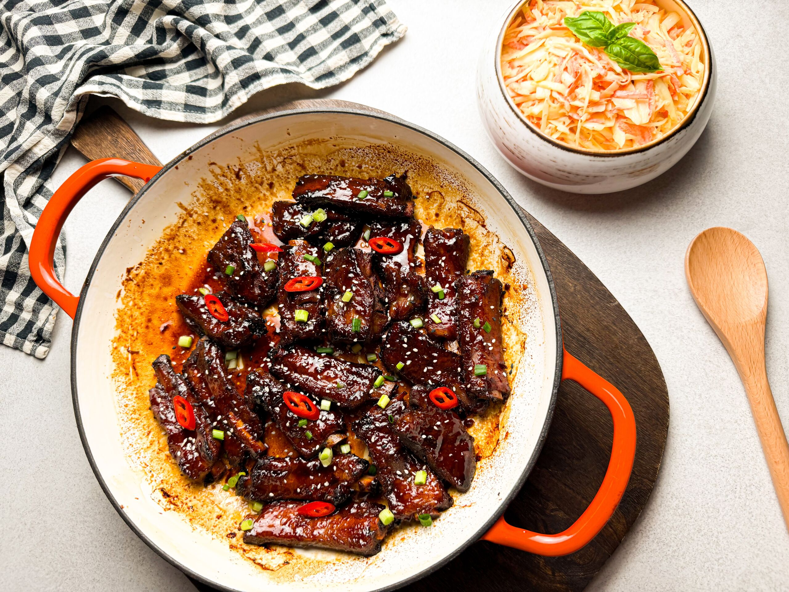- Iškepusius šonkauliukus, jei norisi, dar pabarstome sezamų sėklomis, smulkintu čili bei svogūnų laiškais. Patiekiame su „coleslaw“ salotomis ar kitais norimais garnyrais.