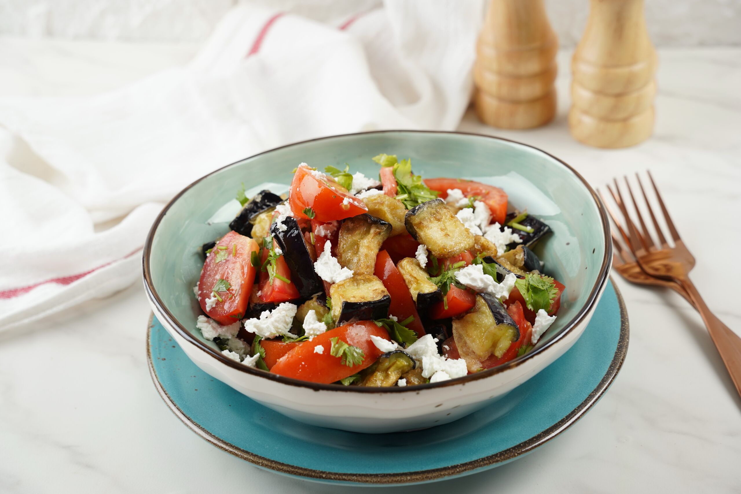 Tokios salotos patinka net tiems, kurie baklažano paprastai nesirenka. Tinkamai paruoštas jis būna ne kartus, o labai aromatingas ir sotus. Be to, šis receptas lengvai pritaikomas pagal tai, ką turite namuose – galite papildyti fetos sūriu, avinžirniais, pomidorais ar mėgstamais žalumynais.