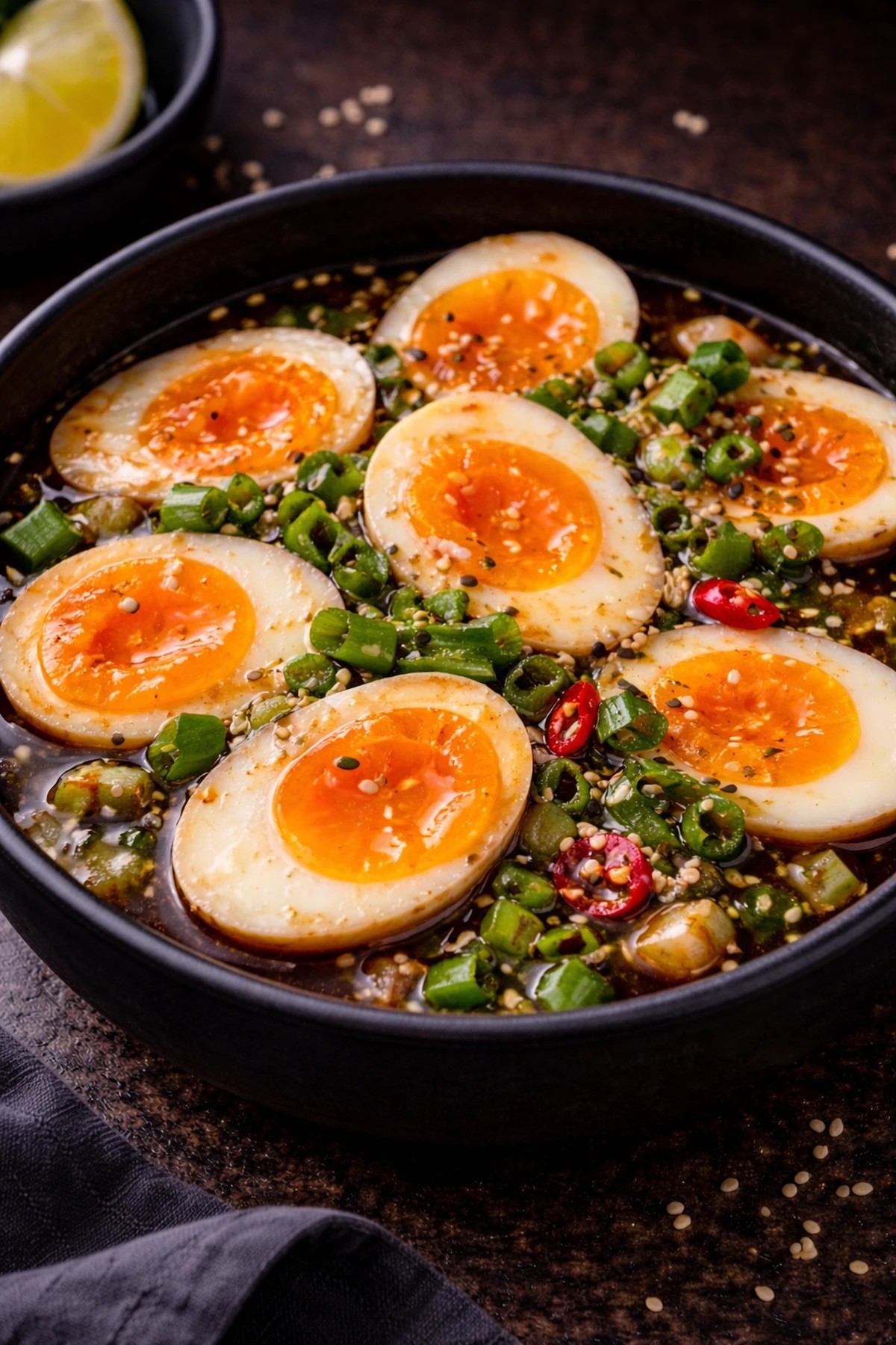 Kiaušiniai marinate gali būti laikomi vos kelias valandas, tačiau šefas pataria – geriausią rezultatą pasieksite palikę juos per naktį. Tuomet skonis tampa sodrus ir gilus. Be to, šaldytuve juos galima laikyti iki 4–5 dienų, todėl juos patogu pasiruošti iš anksto.