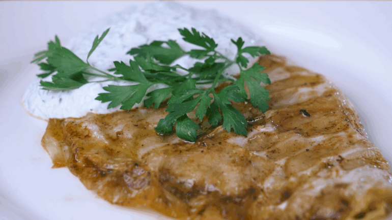 Pagaminkite padažą. Krapus ir česnako skiltelę smulkiai sukapokite ir sudėkite į dubenį. Įdėkite jogurtą, grietinę, prieskonius ir viską labai gerai išmaišykite. Skanaus!