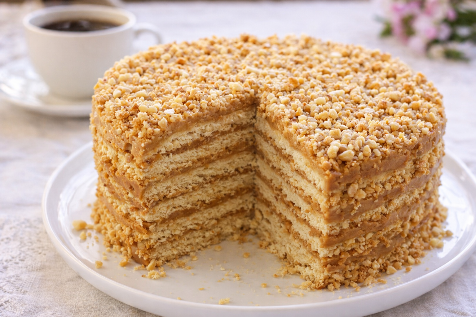 Šis tortas išsiskiria tuo, kad jo skonis sodrus, bet ne pernelyg sunkus. Trapūs lakštai susilieja su kremu, todėl kiekvienas kąsnis būna minkštas, drėgnas ir maloniai tirpstantis burnoje. Karamelinis atspalvis suteikia jaukumo, o riešutai įneša tekstūros ir papildomo skonio gilumo.