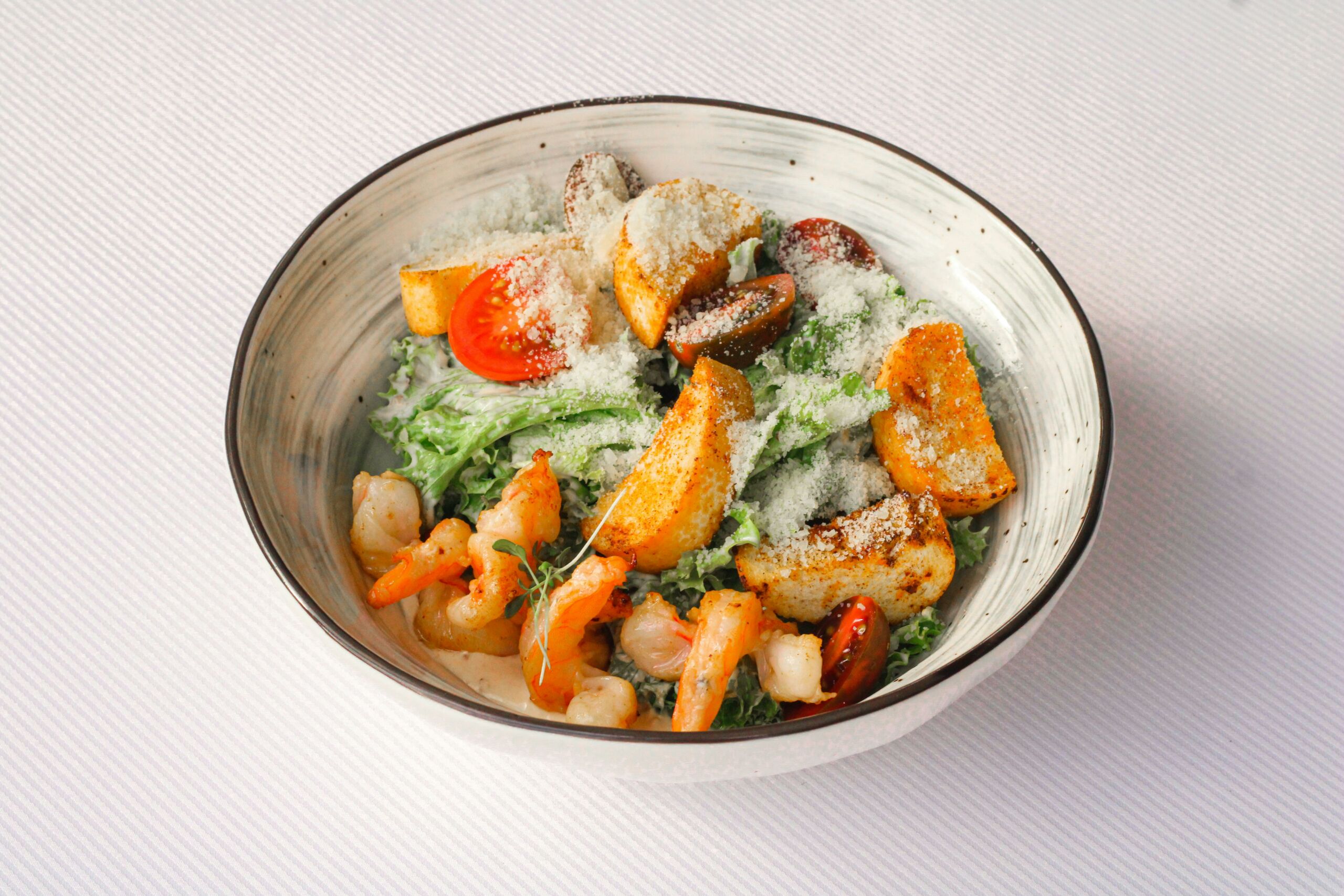 Prie krevečių ypač tinka gaivūs ingredientai – įvairūs salotų lapai, agurkai, pomidorai, avokadai ar citrusiniai vaisiai. Šie produktai ne tik išryškina jūros gėrybių skonį, bet ir suteikia patiekalui lengvumo.