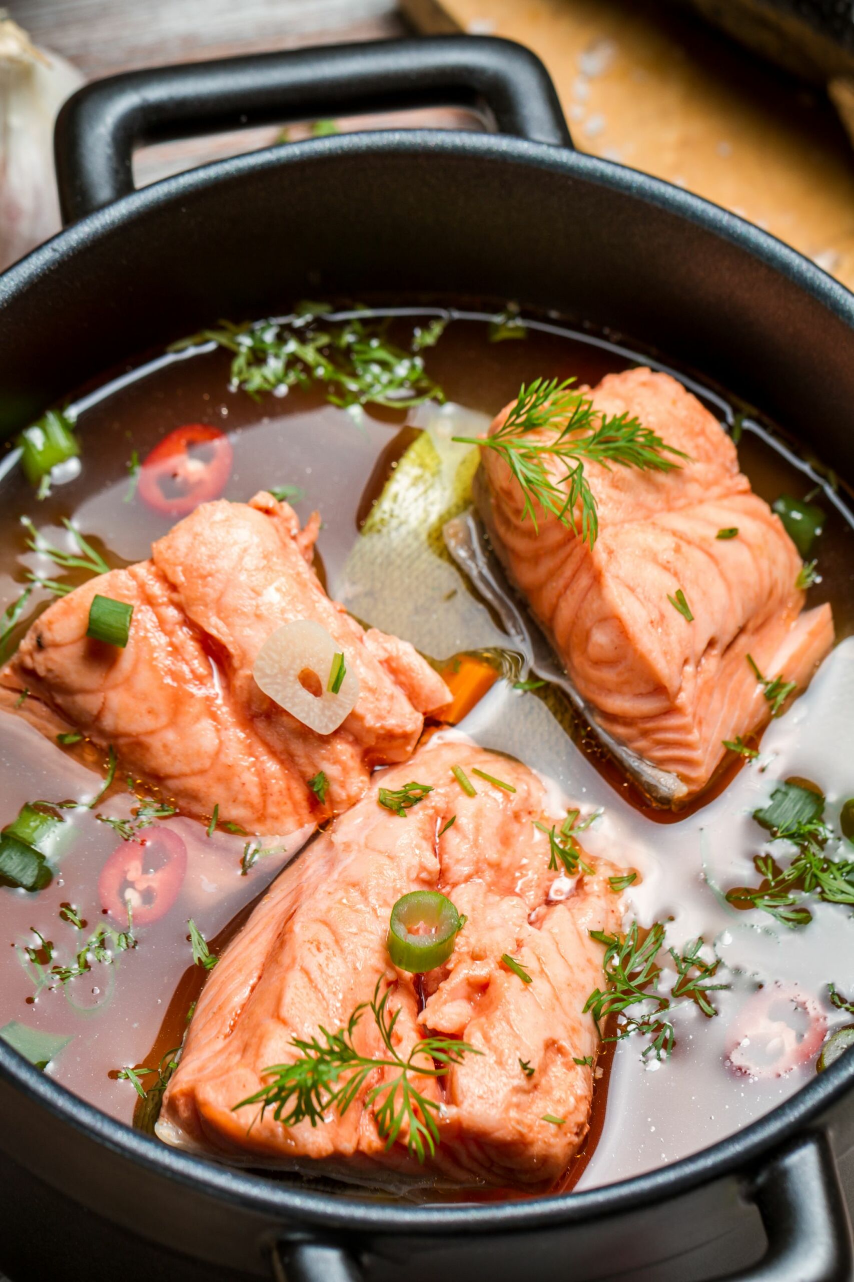 Gaminimas. Upėtakio filė nuplaukite, nusausinkite ir supjaustykite norimo dydžio gabalais. Į puodą sudėkite citrinos griežinėlius, pjaustytus porus ir morkas, supilkite sultinį. Užvirkite ir, sumažinę ugnį iki vidutinės, atsargiai sudėkite upėtakio filė. Uždenkite dangčiu ir virkite 8–10 minučių. Patiekite su bulvių koše.